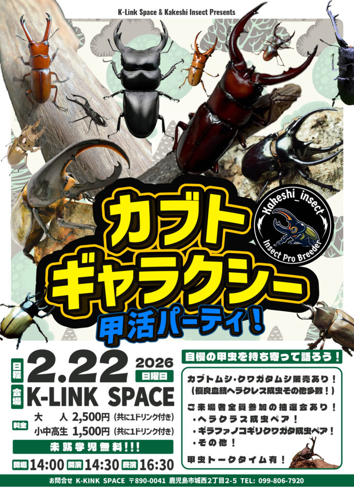 ご来場者全員参加の抽選会あり!(16:00スタート!)(ヘラクラス成虫ペア!ギラファノコギリクワガタ成虫ペア!その他!)